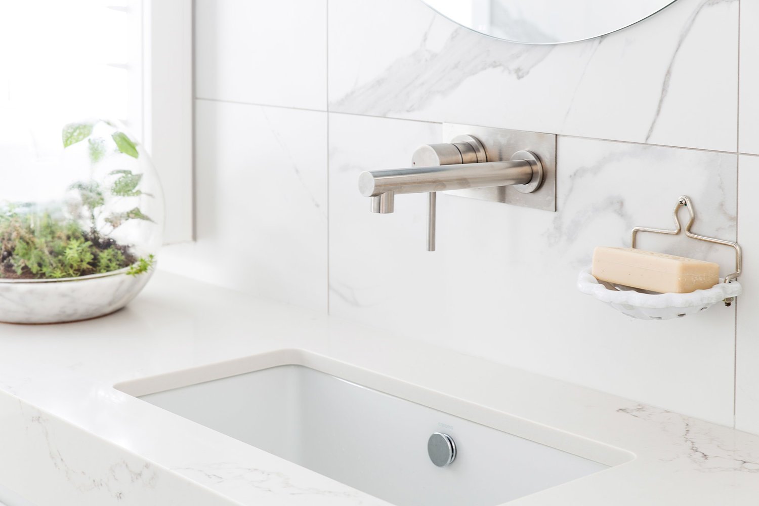 In short, keep it simple. Steer away from bold tile choices or tapware styles that you love now but that may not date well. Choose classic tiles and timeless fittings, bringing personality into your bathroom through styling. Then style your bathrooms as beautifully as any other room in the house. Greenery, rattan furniture, plush towels, candles, and flowers are all lovely ways to help create atmosphere and can totally change the look of a bathroom.