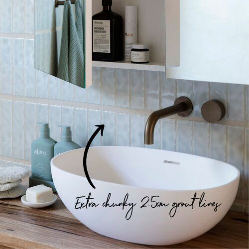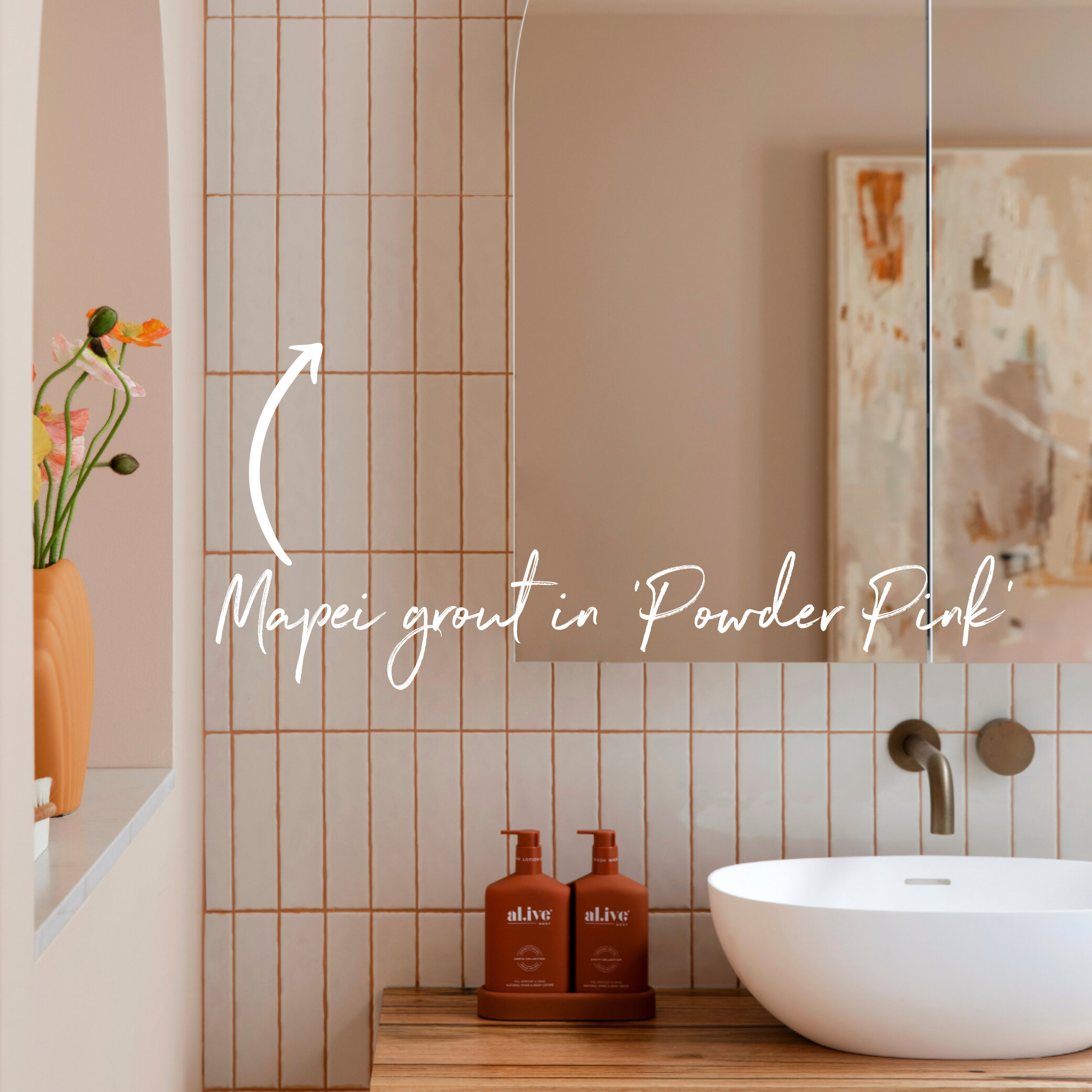 At House 12 we went to town with gorgeous grout lines and really made a feature of them. The grout colour selected plays a crucial role in enhancing the overall design. In the master ensuite, we used Mapei ‘Powder Pink’ for maximum ‘pop’, and in the main bathroom, we dialled up the thickness of the horizontal lines to a whopping 2.5cm of gorgeous Mapei ‘Carribean’ grout.