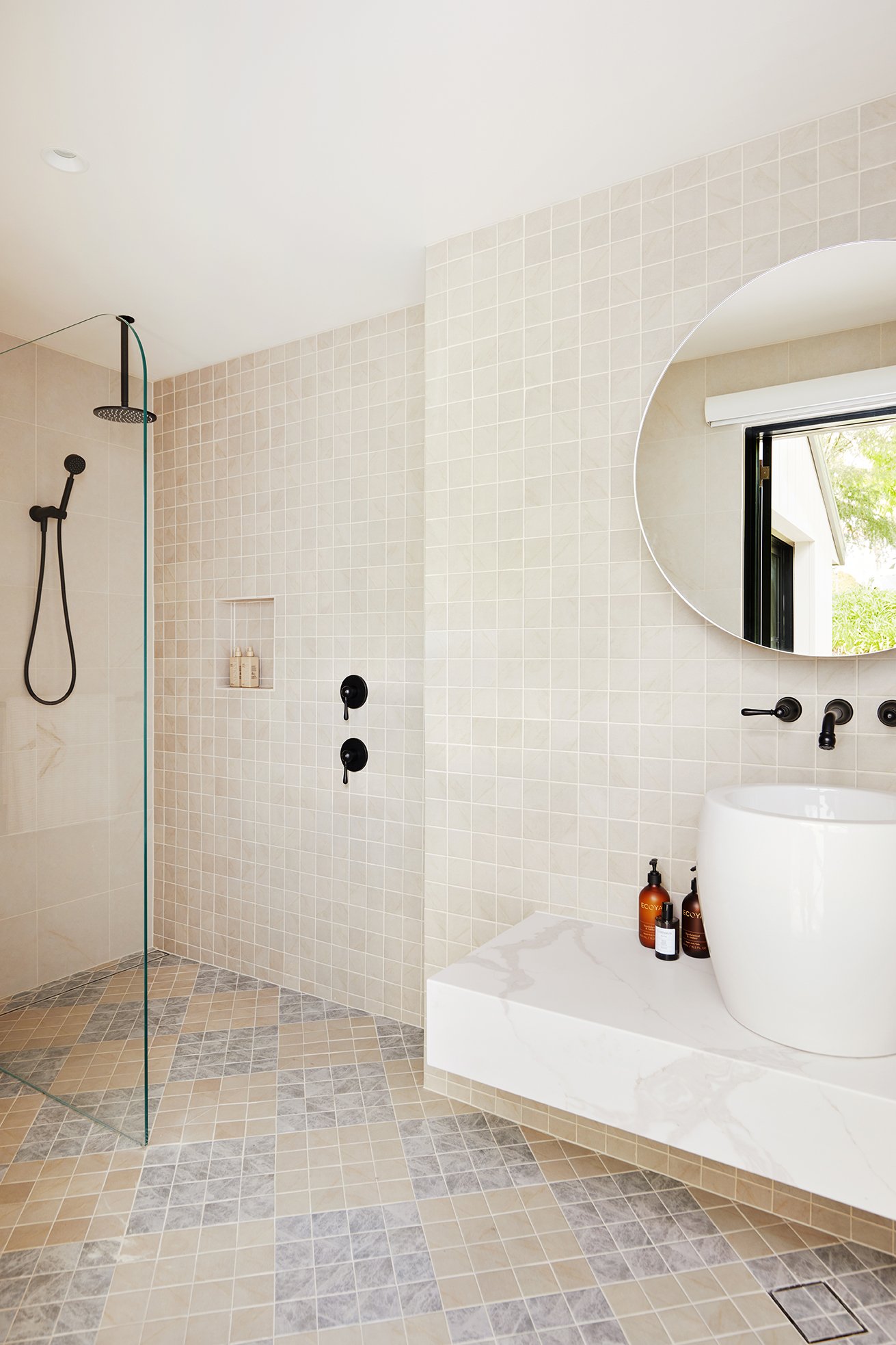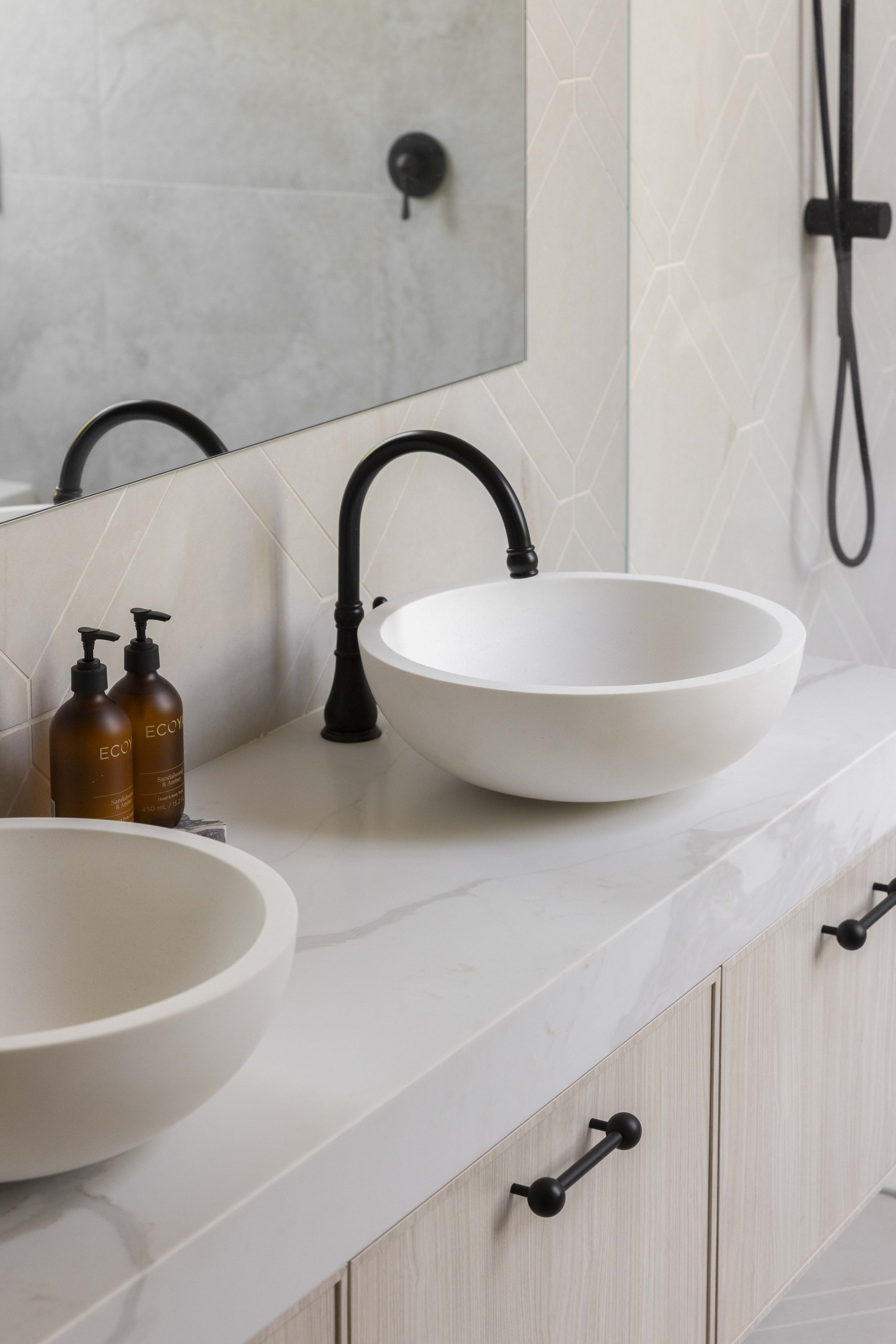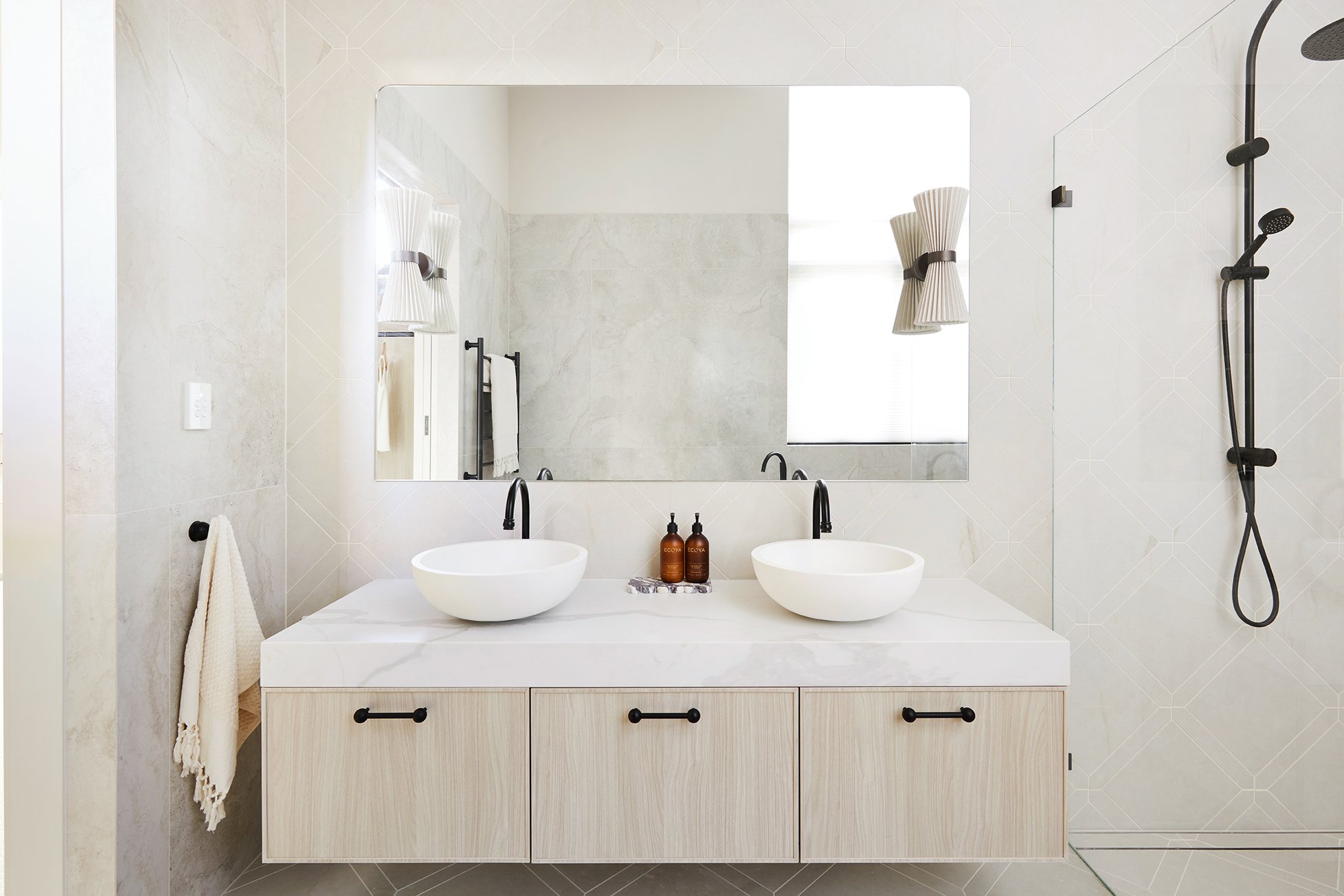 The tiles are different selections from TileCloud. The ones on my ensuite floor (Arrawarra Cream Calacatta Look with picket border) are my favourites in the entire house.