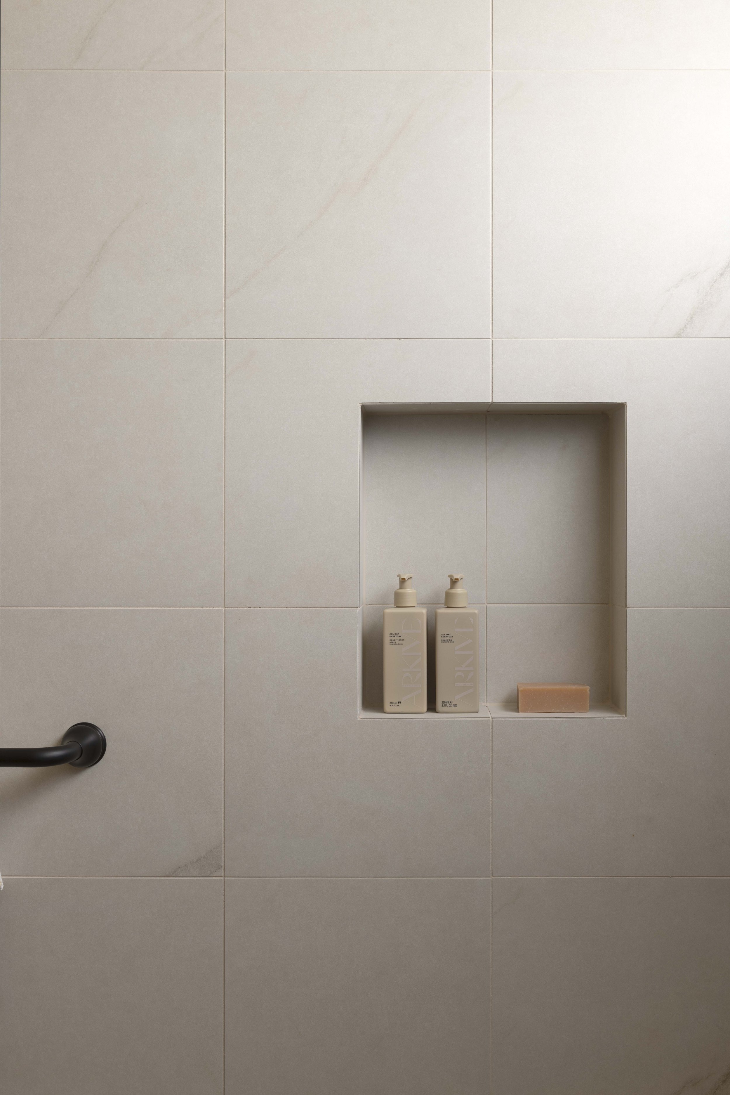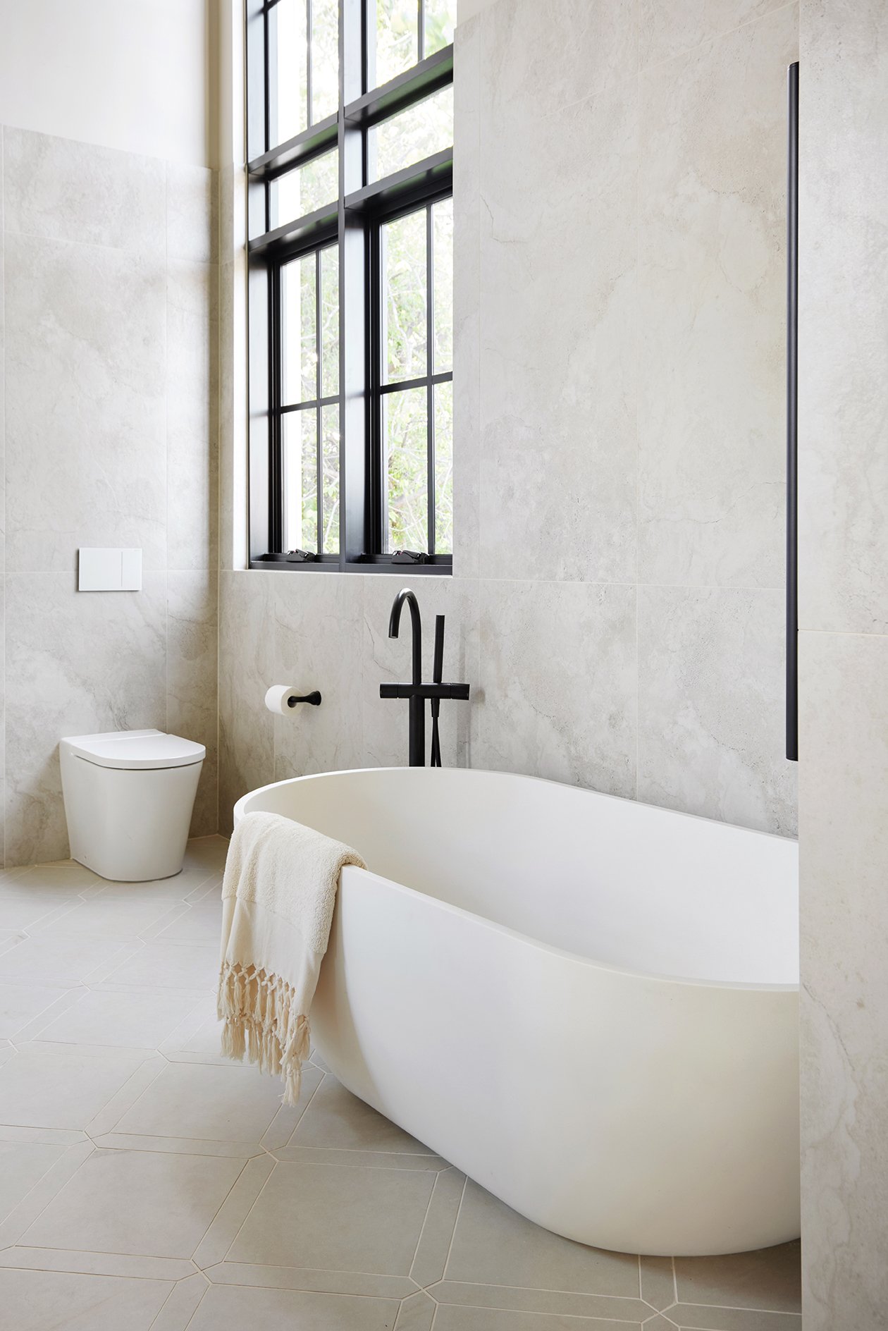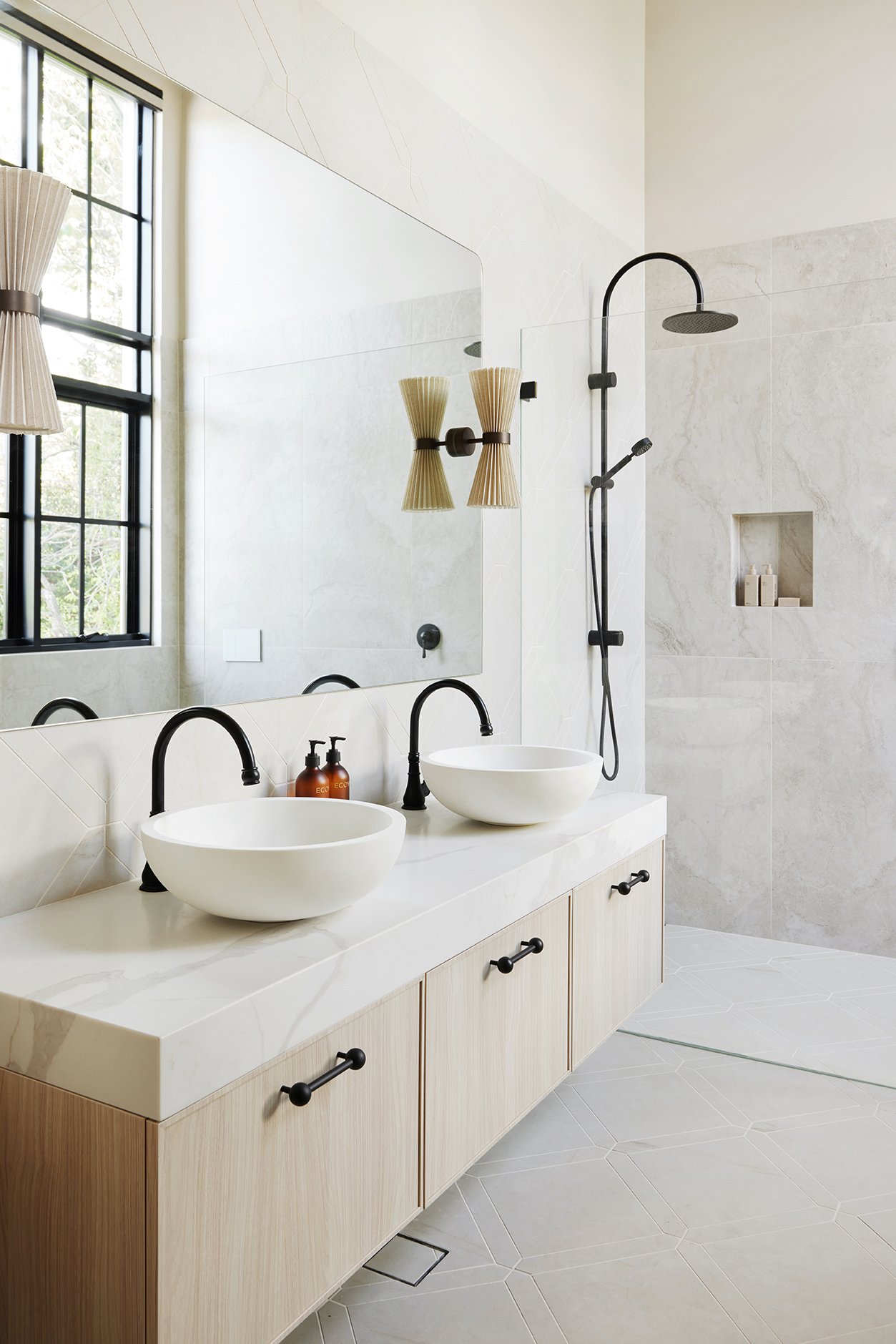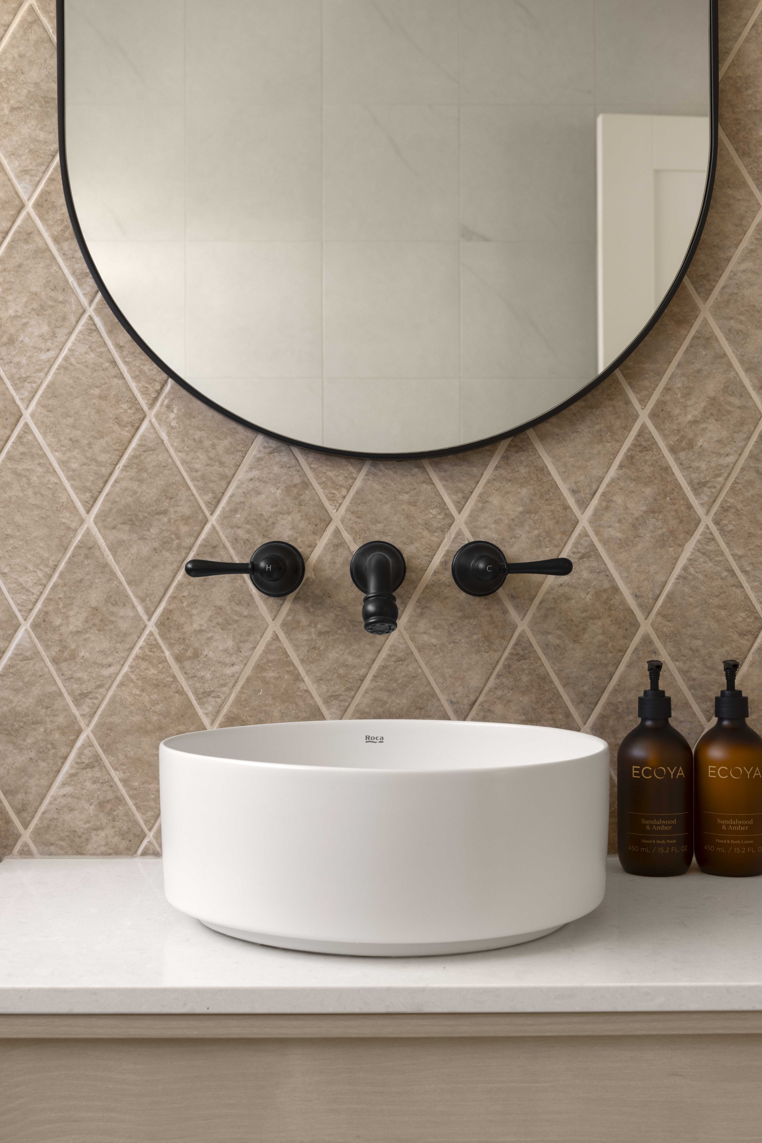 The tiles are different selections from TileCloud. The ones on my ensuite floor (Arrawarra Cream Calacatta Look with picket border) are my favourites in the entire house.