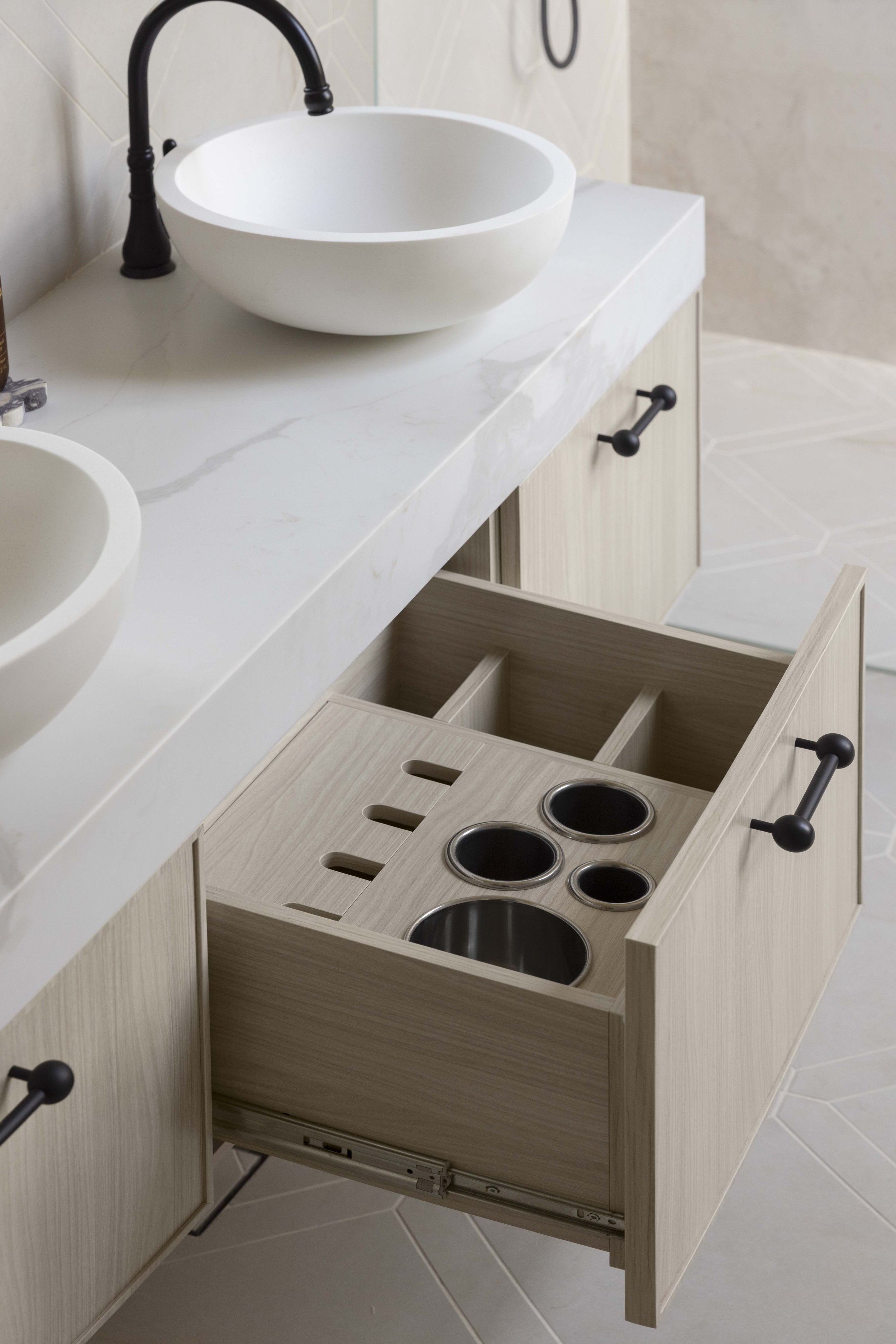 Good spotting! Yes, the middle drawer of our vanity ensuite has built-in powerpoints and specifically designed storage for a hair straightener, hair dryer and curler. How good is that? This custom vanity was made by Carrera by Design and Ronnie and the team can help you customise yours too.