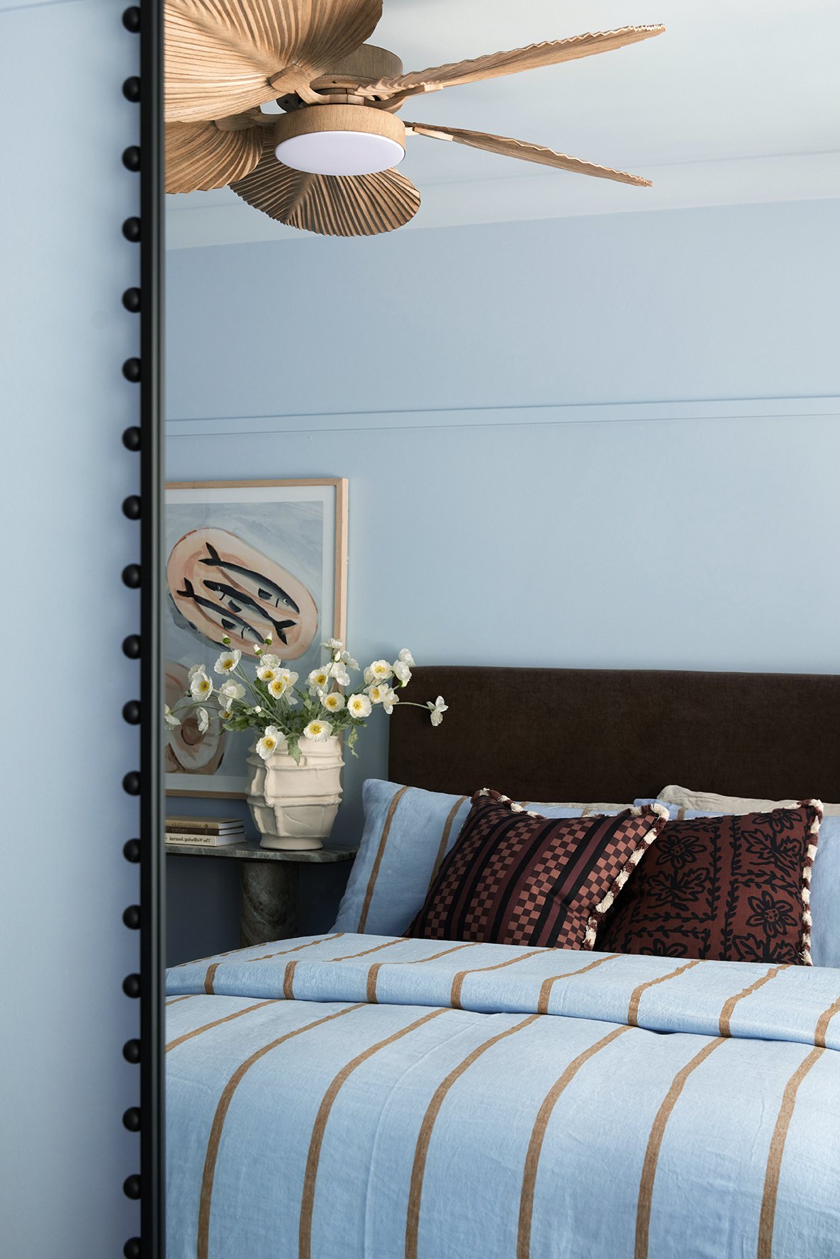 The guest bedroom is painted in Dulux Vanilla Ice Half, used on all surfaces for a soft, calming feel. Paired with earthy styling, it proves once again that blue and brown are a match made in heaven.