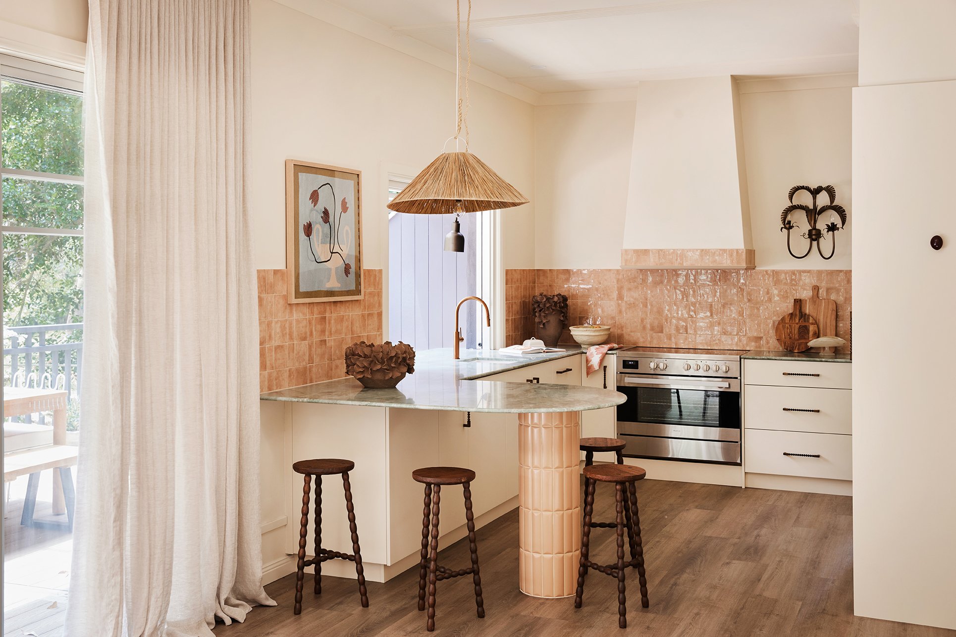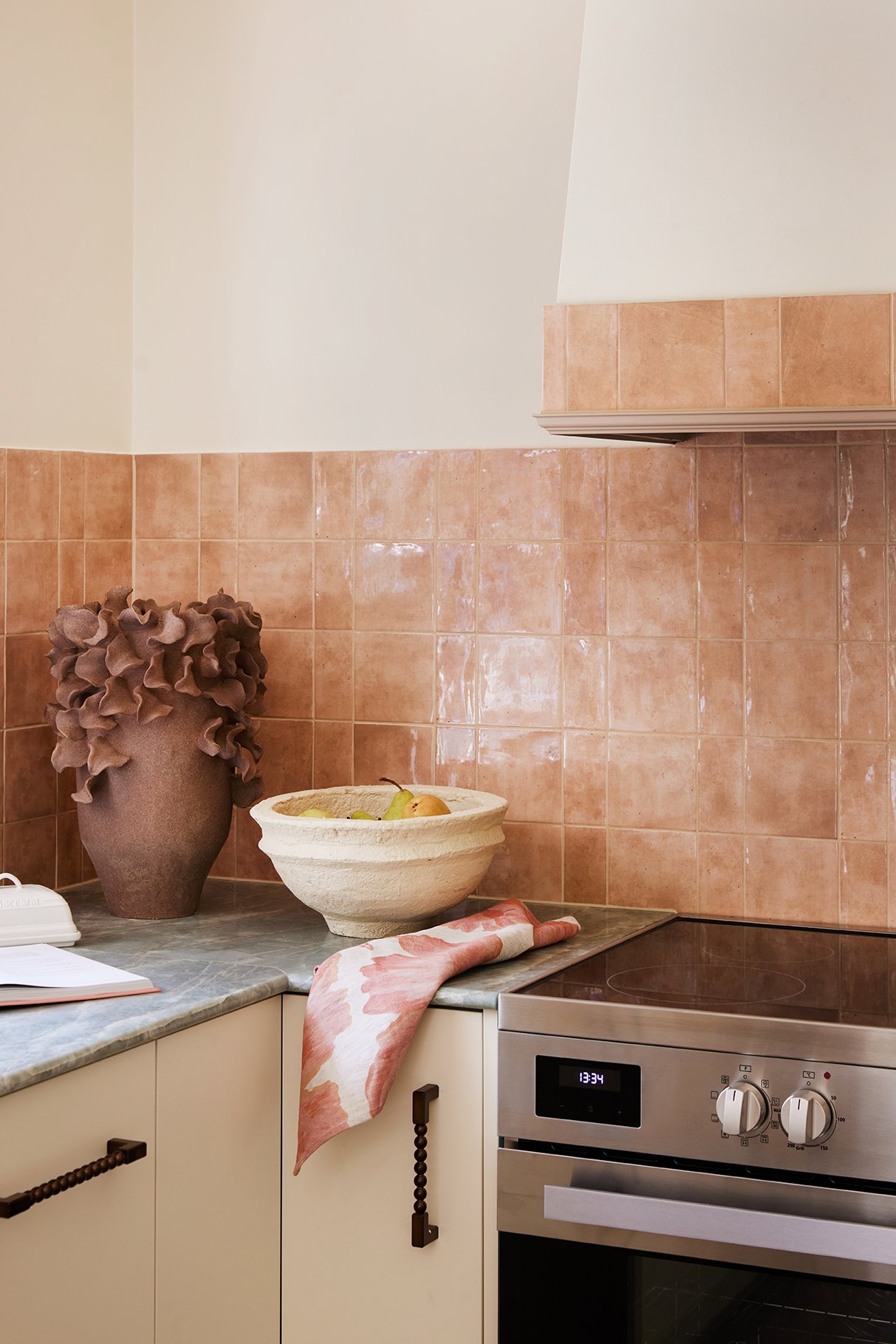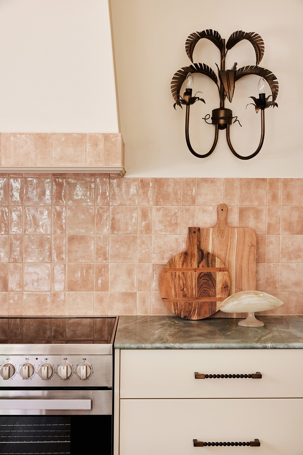 For the splashback and a feature border on the rangehood, we used the gorgeous glossy ‘Hue’ tiles in the colour Clay from Amber, laid in a mix of squares and rectangles for that perfectly imperfect, handmade look. The warm clay tone works beautifully with the green onyx, so we leaned into it and created another little design moment by tiling the leg of the island in a complementary terracotta tone - this time using the Cushion Subway tile.