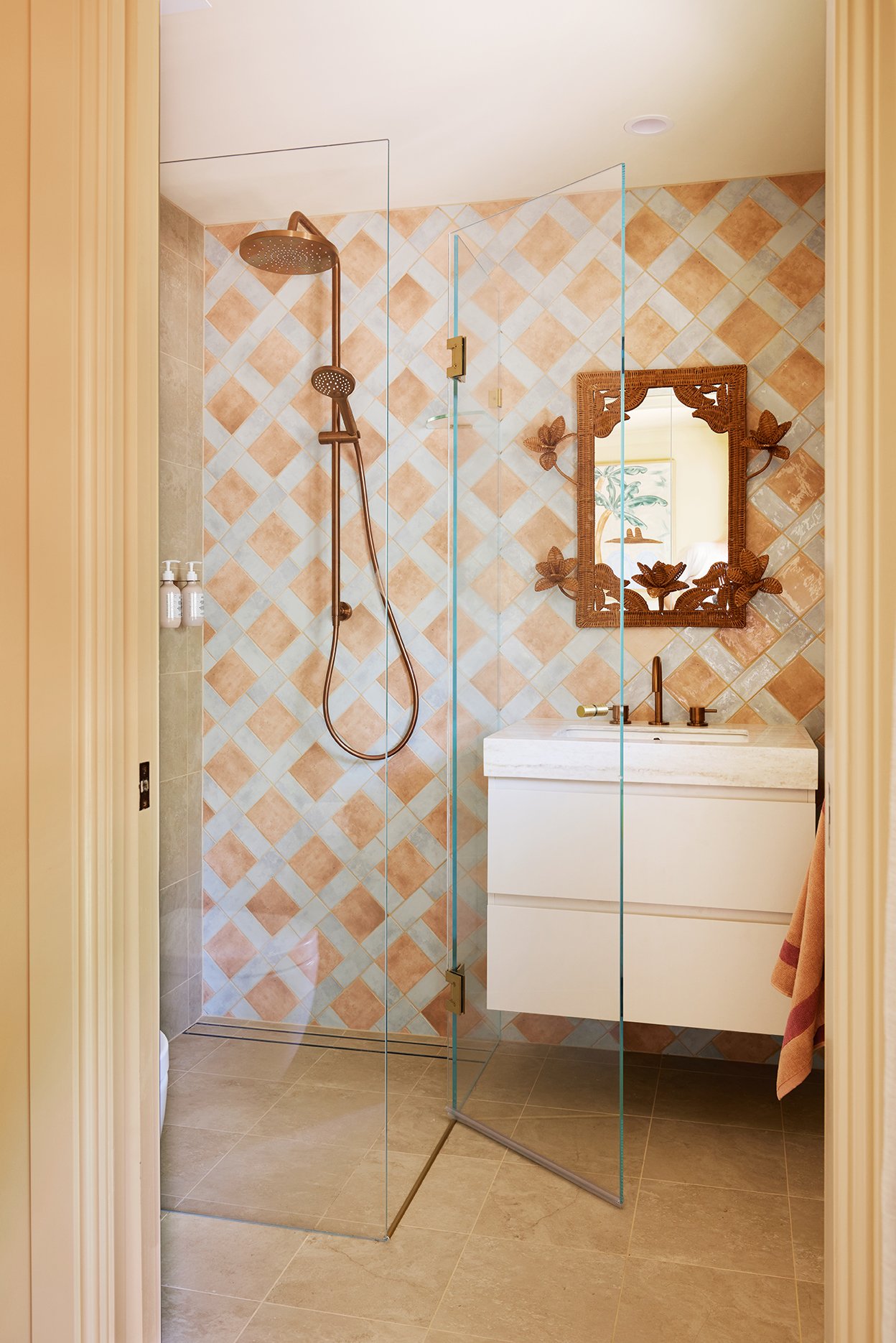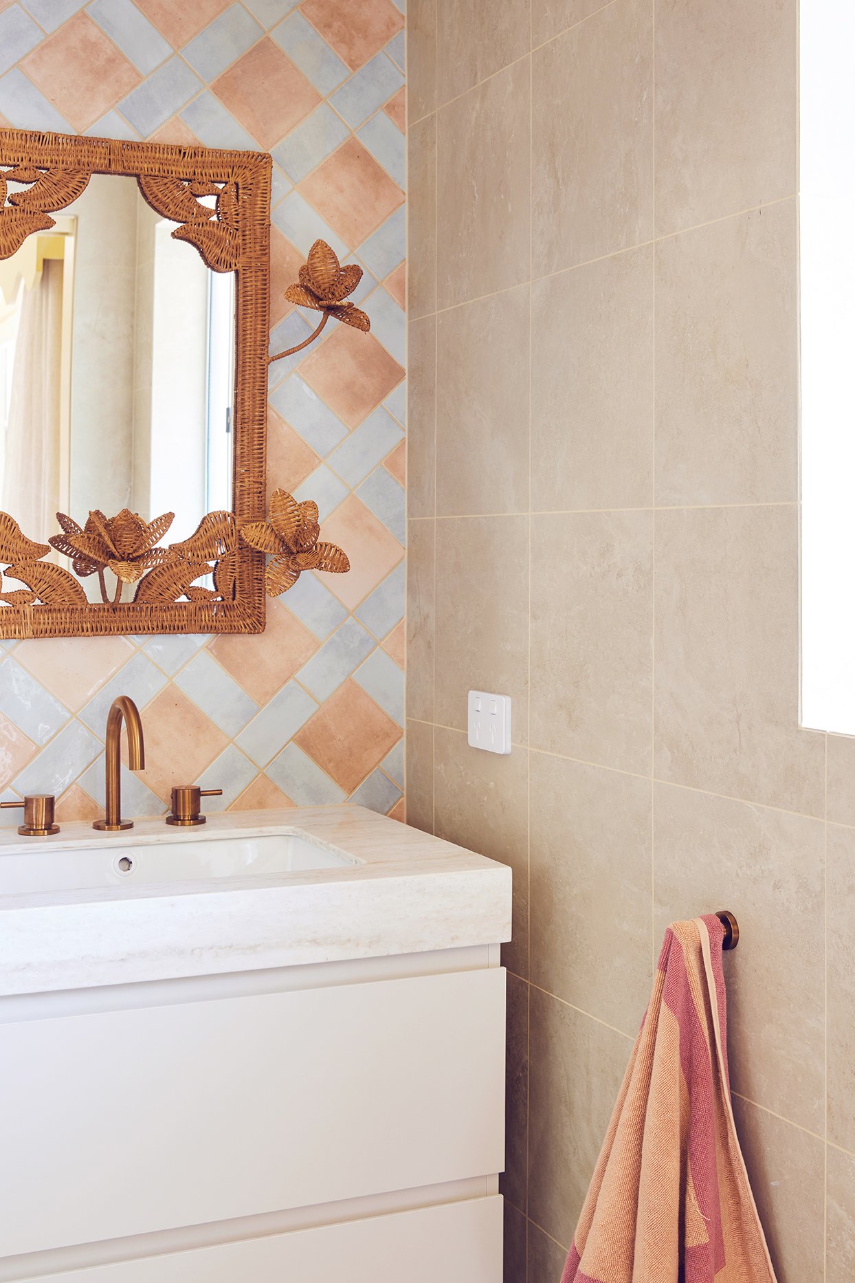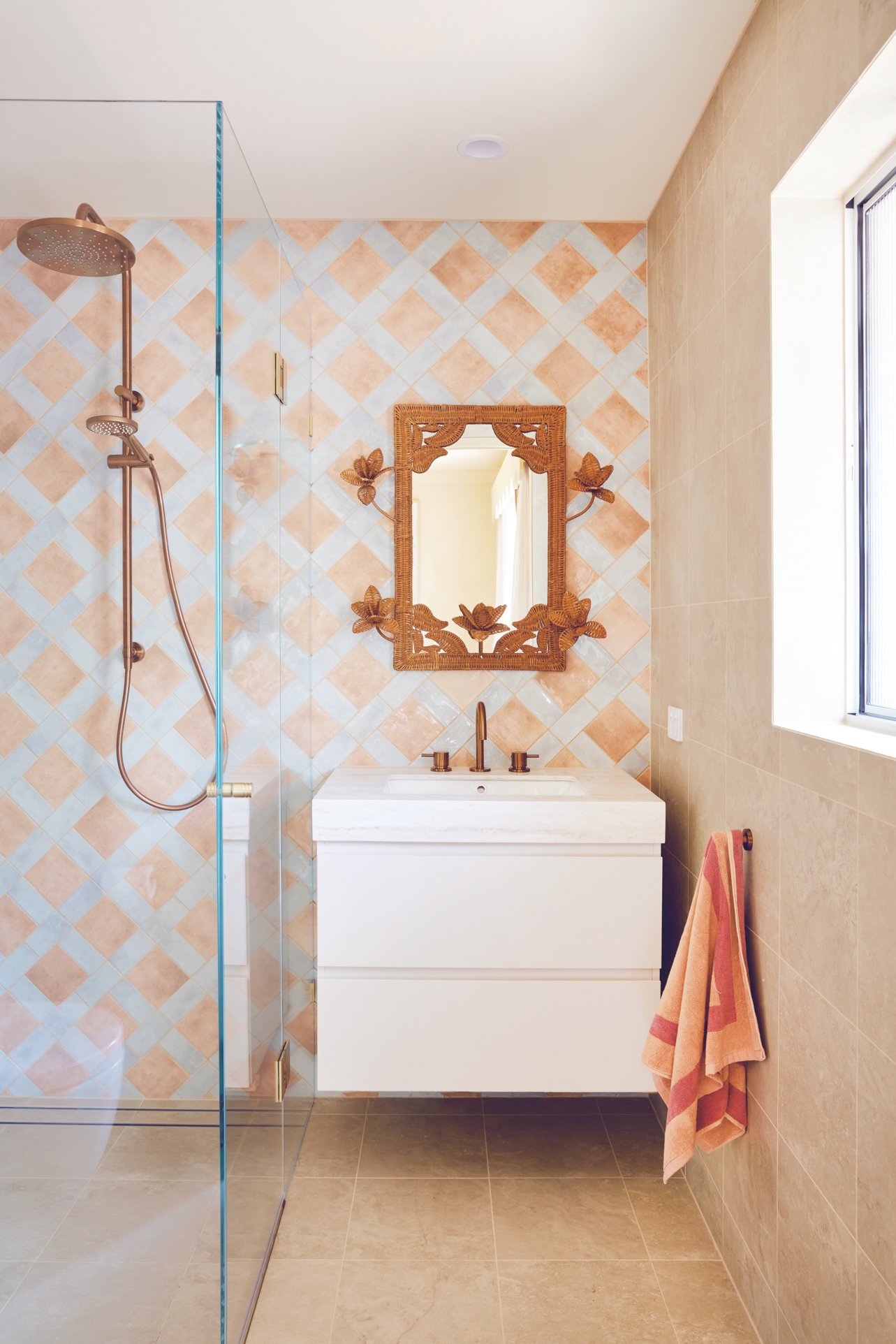 The ensuite packs a punch with colour and pattern. Amber ‘Travertine’ Matte tiles in Ivory were used on both the floor and walls to create a calm, sandy base that feels perfectly at home in this relaxed coastal setting. They give you all the beauty of natural travertine, but in a durable porcelain tile that’s easy to live with – ideal for a high-traffic holiday house. The ‘Hue’ tiles pop up again too, this time in Ocean paired with Clay, adding just the right amount of colour without overpowering the space.