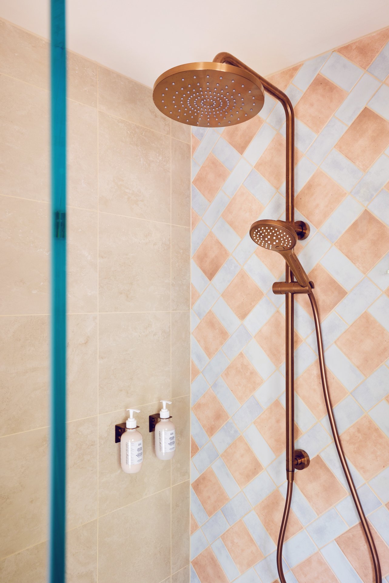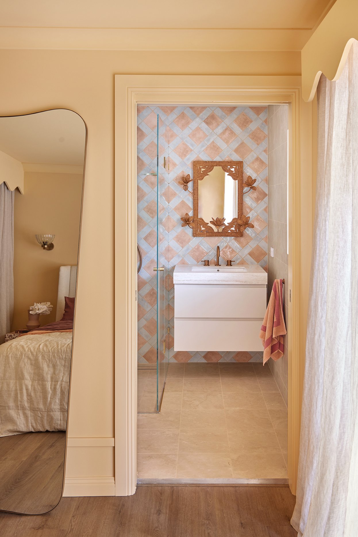 In the main bathroom, colour takes centre stage. We used 200x200 ‘Tiffany’ tiles in Blue and Butter (available in-store at Amber) to create the sweetest checkerboard pattern on the floor. The walls are finished in the same ‘Tiffany’ tile in Butter, keeping the space warm and light, while ‘Hue’ Gloss tiles in Clay add a detail that ties beautifully back to the kitchen and living areas.