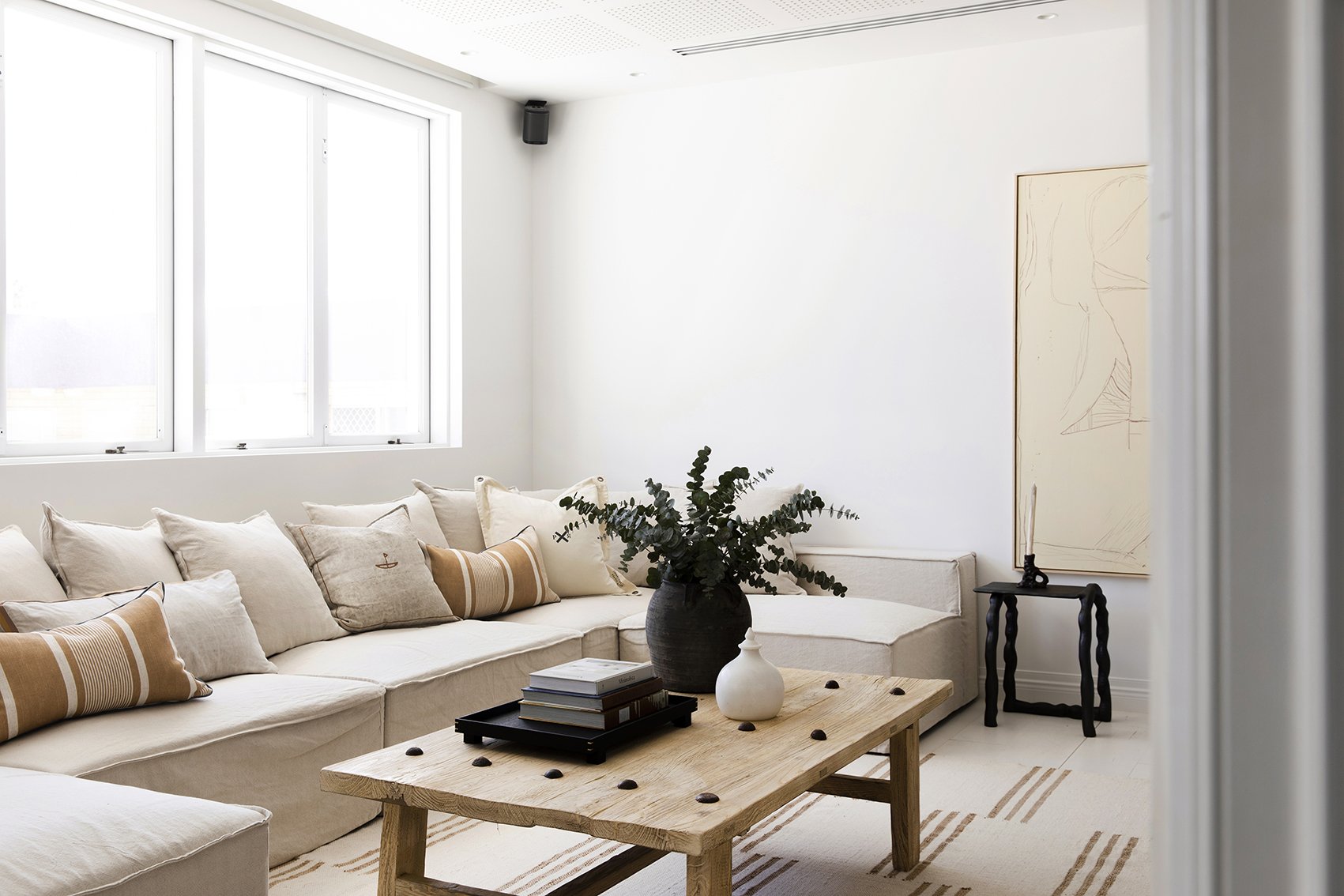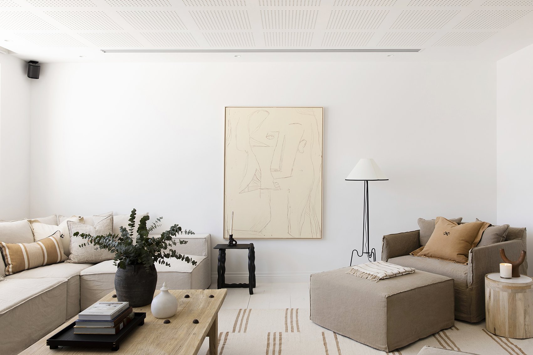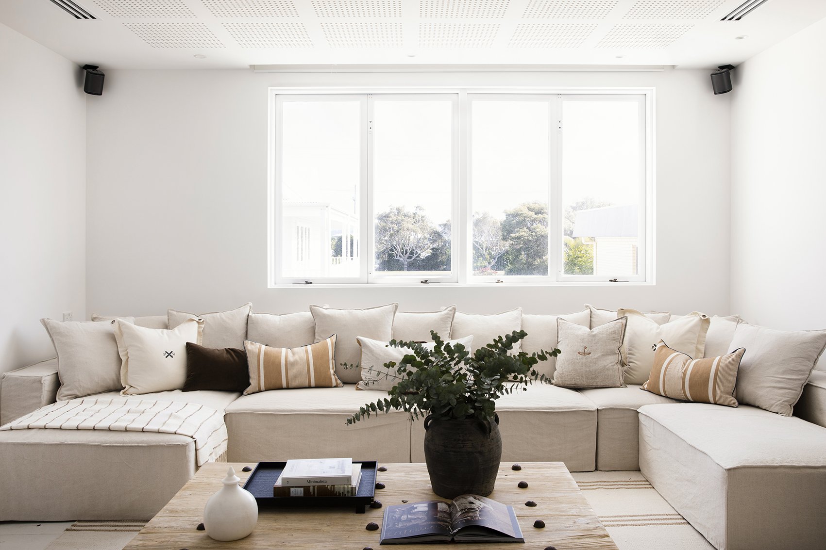 With the biggest TV we’ve ever seen, soundproofing and amazing acoustics already in-situ, Mick’s media room was his pride and joy. There was never ever any doubt that this room would remain a movie room so we wanted it to be functional for that purpose, while adding some elements that make it a great room to sit down for a holiday catch-up with friends as well.