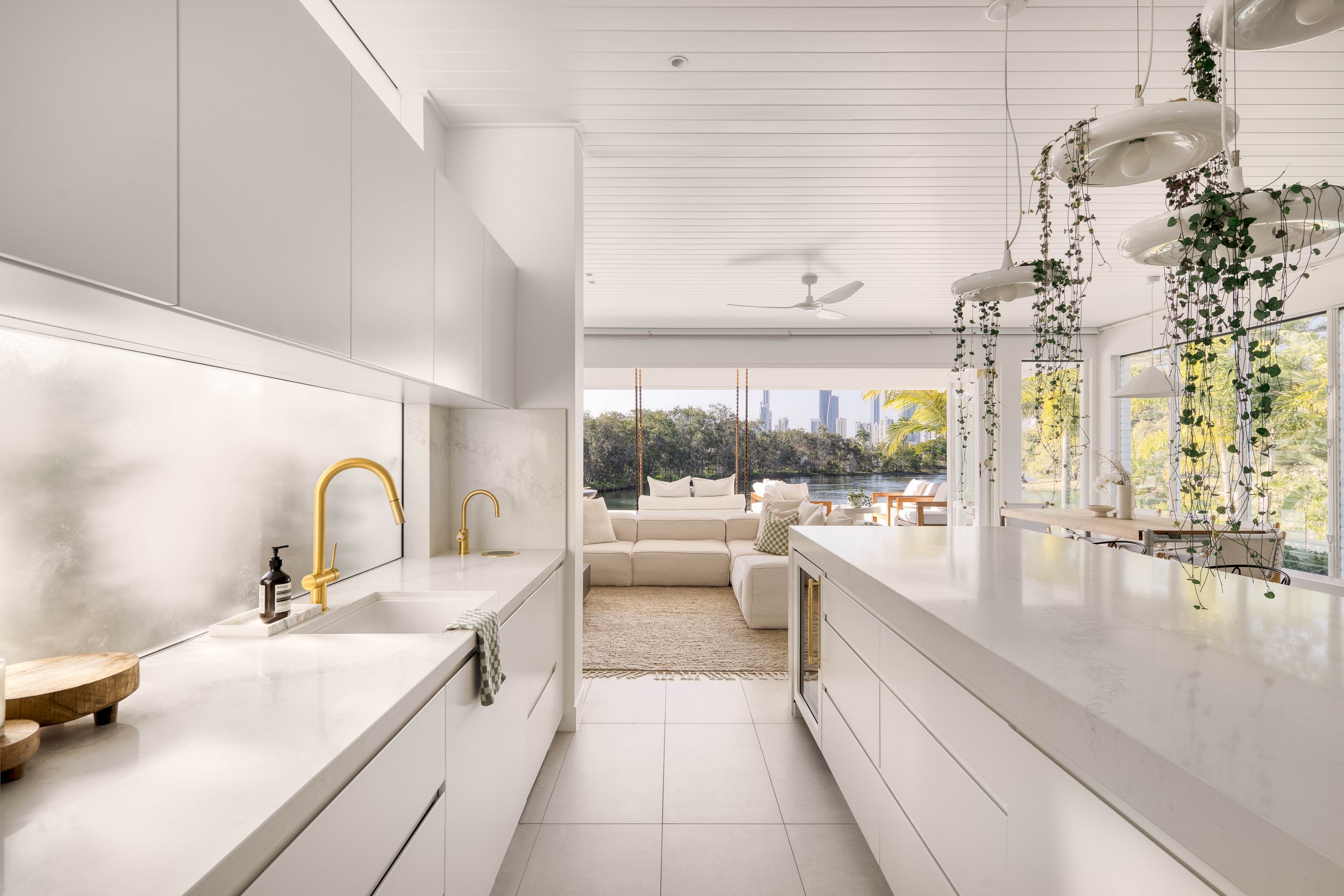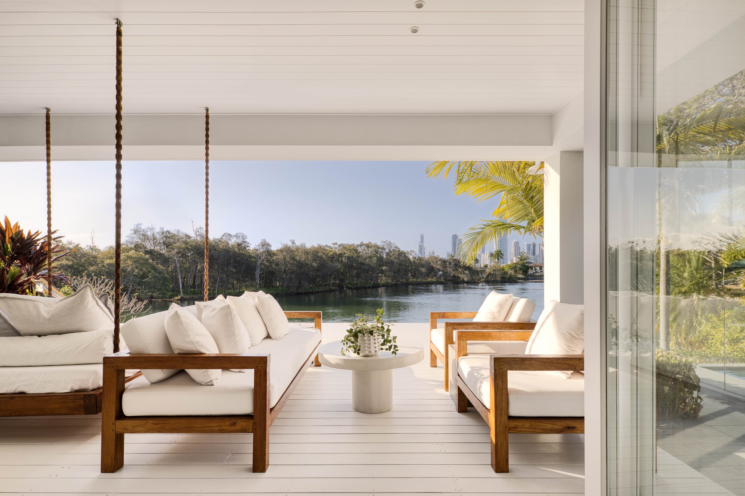 This incredible resort-style home is located on the waterfront with a private pontoon and unobstructed vista of waterways. Reno School Student Tennille has spared no detail when renovating this home, from the custom hanging daybed on the front veranda with evening views of the bright lights of the Gold Coast to the walk-in-robe of any girl’s dreams.
