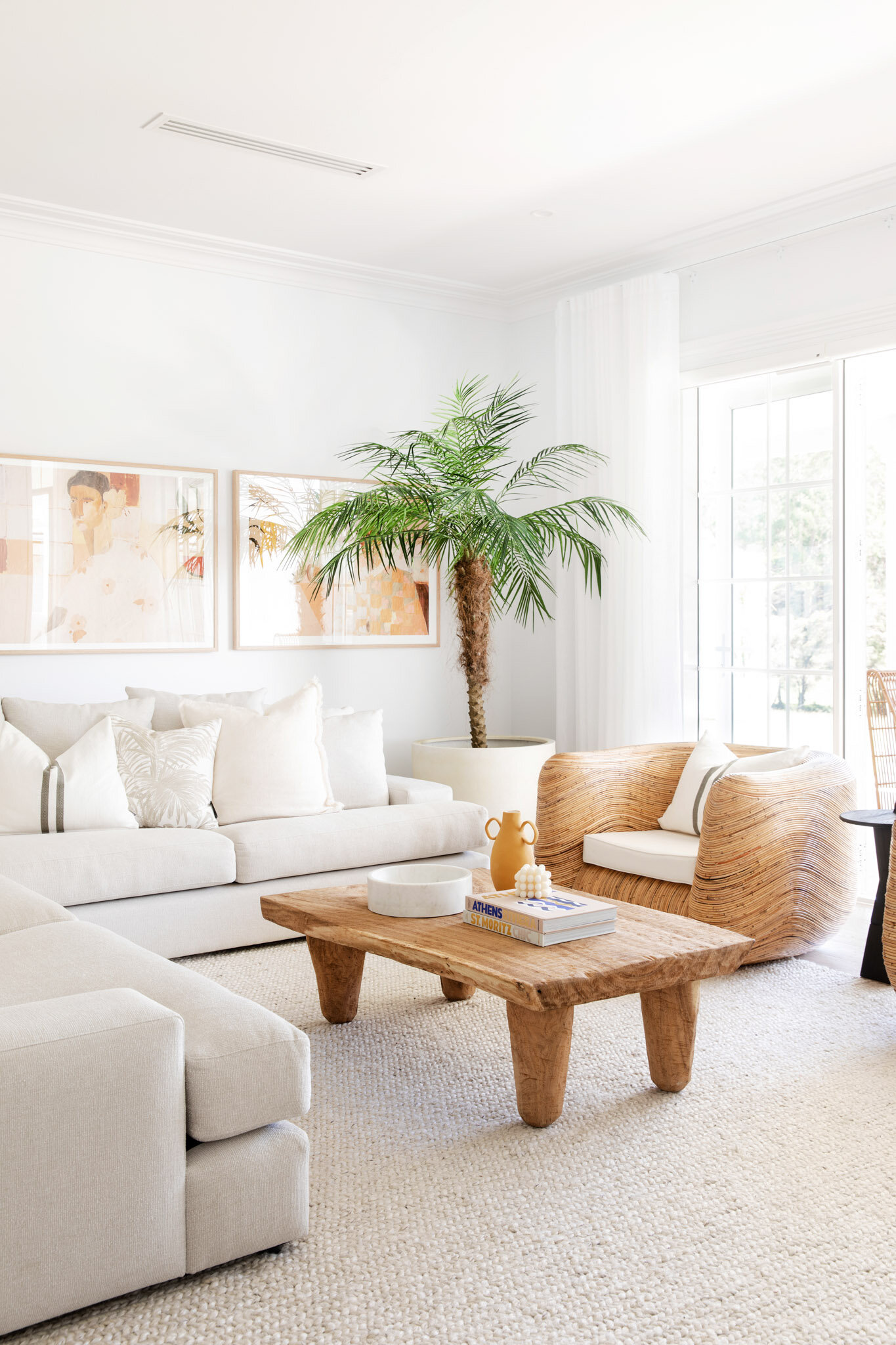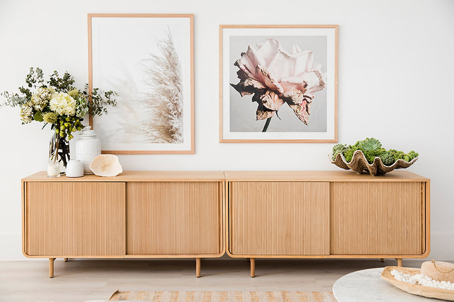 Having a hero piece on the wall above the sideboard is a no-brainer because it’s going to create a focal point. This wall hero could be a gorgeous print (or gallery of prints), a stunning mirror or a textural feast with something like a juju hat. Once you know what you’re going to place above the console, your next decision is where to position it – centred or off-centre. There is no ‘right’ way here, it really just depends on what will look better with the decorative pieces you’re going to use and whether you want to create symmetrical or asymmetrical balance. Both can look beautiful, but we usually gravitate towards an asymmetrical look. It’s a little fresher and more relaxed, and we like that.