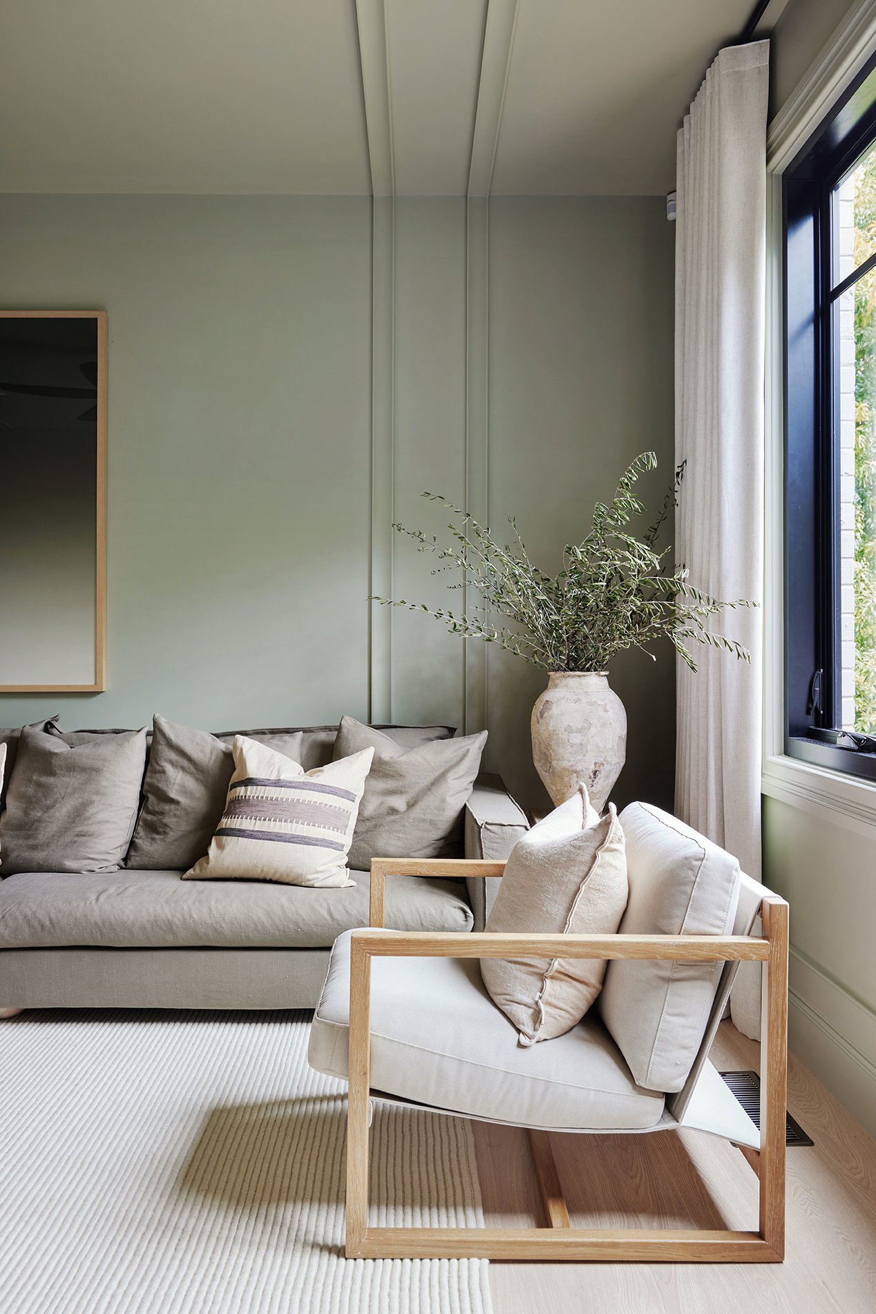 Erin’s sofa is ‘brushed linen’, a fabrication unique to MCM House that offers a strengthened blend of cotton and linen fibres for a stronger, more durable weave. It has all the good looks of linen but is less prone to stretching. This finely milled fabric undergoes an extra finishing treatment for a stone-washed finish that feels ultra-soft.